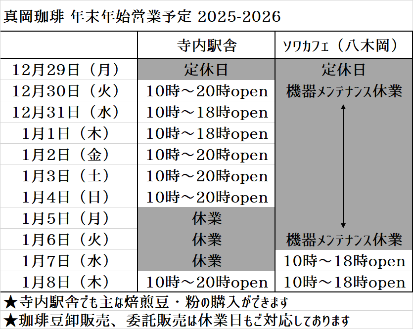 真岡珈琲年末年始の営業スケジュール